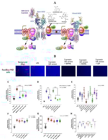 (A) We propose that the ACE2 receptor exists in a multimeric receptor complex with neuromedin-B GPCR receptor, ACE2, and Neu1 in naïve (unstimulated) and stimulated ACE2-expressing cells. Here, a novel molecular signaling platform regulating the interaction and signaling mechanism(s) between these molecules on the cell surface uncovers an S protein induced ACE2 activation signaling axis mediated by Neu1 sialidase activation and the modification of ACE2 PD glycosylation. This signaling platform potentiates neuraminidase-1 (Neu1) and matrix metalloproteinase-9 (MMP-9) crosstalk on the cell surface, which is essential for activating ACE2. Notes: SAR-CoV-2 S protein triggers ACE2 conformational change to potentiate NMBR-ACE2 signaling and MMP-9 activation to induce Neu1 sialidase. Activated MMP-9 is proposed to remove the elastin-binding protein (EBP) as part of the molecular multi-enzymatic complex that contains β-galactosidase/Neu1 and protective protein cathepsin A (PPCA). Activated Neu1 hydrolyzes α-2,3 sialyl residues at the ectodomain of ACE2 to remove steric hindrance to facilitate ACE2 subunits association, activation, and subsequent cellular entry. Oseltamivir phosphate (OP), acetylsalicylic acid and peramivir inhibit Neu1 sialidase activity. Abbreviations: PI3K: phosphatidylinositol 3-kinase; GTP: guanine triphosphate; IRS1: insulin receptor substrate-1; p: phosphorylation. Citation: Taken partly from Haxho et al. Cellular Signalling Volume 43, March 2018, Pages 71–84. © 2023 Alghamdi et al., Published by Elsevier Inc., Open access under CC BY-NC-ND license. This Open Access article permits unrestricted non-commercial use, provided the original work is properly cited. (B–H) RawBlue macrophage cells were allowed to adhere to 12 mm circular glass slides for 24 h at 37 °C in a humidified incubator. After removing the media, 0.318 mM 4-MUNANA substrate in Tris-buffered saline pH 7.4 was added to cells alone (background, Bkg) or with indicated S-proteins 20 µg/mL or endotoxin LPS. In combination with the indicated S-proteins and 200 μg/mL oseltamivir phosphate (OP), 200 μg/mL peramivir (Pera), 200 μg/mL BIM-46174 (BIM46, inhibitor of the heterotrimeric Gα/Gβ/Gy protein complex), 200 μg/mL BIM-23127 (BIM23, a specific neuromedin B receptor inhibitor), 200 µg/mL MMP9 specific inhibitor (MMP9i) or 12 mM aspirin (ASA), the sialidase expression was markedly reduced. Fluorescent images were taken at 2 min after adding substrate using epi-fluorescent microscopy (40× objective). The mean fluorescence surrounding the cells for each image was measured using Image J Software. The results are depicted as a scatter plot of data point visualization using dots to represent the fluorescence values (n = 50) obtained from one representative experiment of 3 separate experiments with similar results. The relative fluorescence values of each group were compared to the indicated group by ANOVA using the uncorrected Fisher’s LSD multiple comparisons test with 95% confidence with indicated asterisks for statistical significance.
