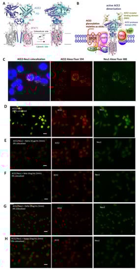 (A) Adapted cartoon representation of the atomic model of the ACE2-B0AT1 complex []. The glycosylation moieties are shown as sticks. The complex subunits are colored, with the PD and CLD in one ACE2 protomer colored cyan and blue, respectively (B,C). Neu-1 (anti-Neu-1 conjugated with Alexa Fluor 488) and ACE2 (anti-ACE2 conjugated with Alexa Fluor 594) colocalize with naïve RAW-blue cells. Cells (50,000 cells) were plated on 12 mm circular glass slides in culture media containing 10% fetal calf sera for 24 h and left untreated as controls. The data represent one of three independent experiments showing similar results. (D–H) RAW-blue cells (50,000 cells) were plated on 12 mm circular glass slides in culture media containing 10% fetal calf sera for 24 h and treated with 10 μg/mL of recombinant S1 spike protein from alpha (E), beta (F), delta (G) and kappa (H) for 5 min. Cells were fixed, permeabilized and immunostained with primary antibodies conjugated with Alex Fluor as in (C). Stained cells were visualized using a Zeiss M2 imager with a 20× objective. The scale bar represents 100 μm.