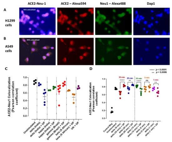 Neu-1 colocalizes with ACE2 (A) H1299 epithelial-like human lung cells and (B) human A549 lung adenocarcinoma cells. Cells (50,000 cells) were plated on 12 mm circular glass slides in culture media containing 10% fetal calf sera for 24 h and treated with 10 μg/mL delta, kappa, gamma, and beta variant S-proteins (C) for indicated times (D) with or without OP (40 mg/mL) or left untreated as controls. Cells were fixed, permeabilized and immunostained with mouse monoclonal anti-Neu-1 conjugated with Alexa488 and mouse monoclonal anti-ACE2 conjugated with Alexa594 antibodies. Stained cells were visualized using a Zeiss M2 imager fluorescent microscope with a 40× objective. The Pearson correlation coefficient was measured on a total of 5 different images per cell and expressed as a percentage using Zeiss M2 imager software to calculate the percentage of colocalization in the selected images. The data represent one of three independent experiments showing similar results.
