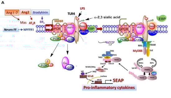 For example, growth factors binding to their RTKs utilize GPCR-signaling molecules to initiate the molecular organizational-signaling platform of a novel Neu-1 and MMP-9 crosstalk in alliance with RTK on the cell surface. We have identified this novel GPCR-signaling platform essential for neurotrophin factor-induced Trk [], insulin [,,,], epidermal growth factor (EGF) [], and TLR [,,] receptors activation processes and downstream cellular signaling. These findings have revealed a novel concept in which GPCR activation is essential for the growth factor and pathogen activation of TLR. The mechanism(s) here involves the formation of a functional signaling complex between the GPCR-RTK and GPCR-TLR partners. To test whether this same organizational signaling platform is involved with ACE2 activation, we initially asked if Neu-1 forms a complex with ACE2 receptors.