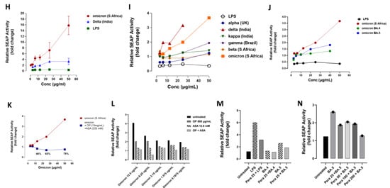 TLR4 ligand, lipopolysaccharide (LPS) from BioVision was used at 50 μg/mL. Neuropeptide FF, bradykinin acetate salt, and angiotensin I-7 human acetate salt (all purchased from Sigma-Aldrich) diluted in Tris-buffered saline (TBS, pH 7.4) were used at indicated concentrations. In the live cell sialidase assay experiments, 2-(4-methylumbelliferyl)-α-D-N-acetylneuraminic acid (98% pure 4-MUNANA; Biosynth International Inc., Itasca, IL, USA) is a sialidase substrate used at a pre-determined concentration of 0.318 mM diluted in TBS. Recombinant spike His-tag proteins were obtained from R&D Systems a Biotechne brand with the following samples: Alpha variant (UK, SARS-CoV-2 B.1.1.7 N501Y Spike His-tag Protein, CF, Catalog # 10748-CV-100), Beta variant (S. Africa, SARS-CoV-2 B.1.351 Spike RBD His Protein, CF, Catalog # 10735-CV-100), Delta variant (India, SARS-CoV-2 B.1.617.2 Spike GCN4-IZ Protein, CF, Catalog # 10878-CV-100), Gamma variant (Brazil, SARS-CoV-2 P.1 Spike GCN4-IZ His-tag Protein, CF, Catalog # 10795-CV-100), Kappa variant (India, SARS-CoV-2 B.1.617.1 Spike GCN4-IZ Protein, CF, Catalog # 10861-CV-100), BA.2 variant (omicron, SARS-CoV-2 BA.2 Spike (GCN4-IZ) His Protein, CF, Catalog # 11109-CV-100), BA.4 and BA.5 variants (omicron, SARS-CoV-2 BA.4/BA.5 Spike His-tag Protein, CF, Catalog # 11232-CV-100). Omicron variant (recombinant SARS-CoV-2 B.1.1.529 spike S1 protein, His-tag, Catalog # 40589-V49H6-B) obtained from Sino Biological US Inc., 10101 Southwest Freeway, Suite 100. Houston, TX 77074, USA).