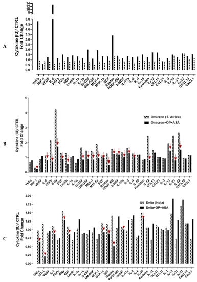 Mouse cytokine ELISA array III (colorimetric) sandwich assay to measure 32 mouse cytokines simultaneously in the supernatants of RawBlue mouse macrophages treated for three days with 50 µg/mL LPS and 6.25 µg/mL omicron S protein (A), omicron plus 800 µg/mL OP and 10 mM ASA treatment (B), and 6.25 µg/mL delta plus 800 μg/mL OP and 10 mM ASA (C) or left untreated as a control. The supernatants were centrifuged to clear any debris, and 100 μL were added to each well of the cytokine ELISA array coated with 32 different antibodies against indicated mouse cytokines for 2 h. at room temperature and mixed on a rocker plate. Cells at 50,000 were plated in 24 well tissue culture plates for 24 h. After the media was removed, the cells were pretreated with 1× DMEM (without supplements) containing LPS (50 µg/mL), omicron (6.25 µg/mL), or delta (6.25 µg/mL) with indicated 800 µg/mL OP plus 10 mM ASA or left untreated as control (bkg). The cell culture supernatants are incubated in the cytokine ELISA microarray plate, and the captured cytokine proteins are subsequently detected with a cocktail of biotinylated detection antibodies. The test sample is allowed to react with a pair of antibodies, resulting in the cytokines between the solid phase and enzyme-linked antibodies. After incubation, the wells are washed to remove unbound-labelled antibodies. To the plate was added streptavidin conjugated horse radish peroxidase (HRP) and substrate TMB (3,3′,5,5′-tetramethylbenzidine). The expression level for each specific cytokine is directly proportional to the luminescent or color intensity. The results are expressed as a fold change of the treated cells to untreated controls.