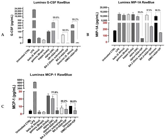 RawBlue macrophage cells were maintained in DMEM supplemented with 10% fetal bovine serum (FBS) and 0.1% plasmocin and grown in T-75 tissue culture flasks up to 70–80% confluence prior to experimental use. Cells at 50,000 were plated in 24 well tissue culture for 24 h. After the media was removed, the cells were pretreated with 1× DMEM (without supplements) containing LPS (50 μg/mL), beta, gamma, kappa, alpha, UK, BA.2 or omicron (6.25 μg/mL) with indicated 800 μg/mL OP plus 10 mM ASA or left untreated as control (bkg). Seventeen tissue culture supernatants were prepared by Dr MR Szewczuk in the Laboratory at Queen’s University and shipped on ice to Encyt Technologies where they were frozen at −80 °C on receipt. On the day of testing, the samples were thawed, vortexed, and then centrifuged for 1 min at 14,000 rpms to ensure samples were free of particles. Samples were prepared for testing on the Luminex® 200™ following the procedure in the MILLIPLEX® Mouse Cytokine/Chemokine Magnetic Panel User Guide for the selected cytokines (Kit Catalog# Hcytomag-70K, Lot#3893941, MilliporeSigma, St. Louis, MO, USA.). The kit and components were stored at 2–8 °C until the day of testing. The cytokines tested in this kit are G-CSF, MIP-1A, and MCP-1.