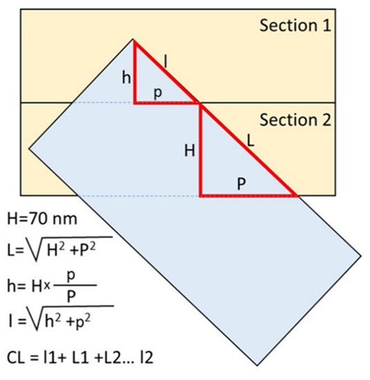 Since the large and small triangles are similar (their corresponding sides are parallel to one other), the ratio of the lengths of their sides is proportional. Therefore, the height of an incomplete section (h) can be calculated from the ratio of the projection lengths on both full and incomplete sections (Figure 1). Next, the length of triplet microtubules in the outermost section (l) was calculated based on the incomplete height and projection (p). The total length of the triplet microtubules of the centriole was the sum of the lengths on all complete sections and one or two incomplete extreme sections (Figure 1). The angle of inclination of the long axis of the centriole to the section plane was determined from the value of tangent, which was equal to the ratio of the length of the opposite leg (the thickness of the section is 70 nm) to the length of the adjacent leg (the centriolar MT projection to the section).