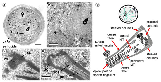 The zygote with two pre-convergence pronuclei has a typical PC and atypical DC (24 h after fertilization). (a) General view of the zygote at low magnification; sperm and egg nuclei are designated as male and female, respectively; (b) apical region of the sperm flagellum near male pronucleus; (c,d) two sections at high magnification; (e) schematic diagram of the structure of the centrosome at this stage. cMT—central MT of flagellum; DF—dense fibers; Fl—flagellum; M—mitochondria of the sperm; PrC—proximal centriole; pMT—MT of peripheral doublets; SC—striated column. Scale bars: (a)—20 µm; (b)—5 µm; (c,d)—0.3 µm. All 10 serial sections at high magnification are presented in Figure S1.