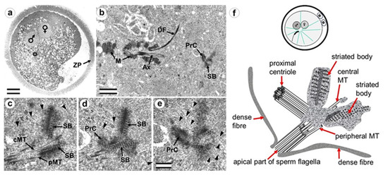 Zygote at the close pronuclei stage (24 h after fertilization) has the sperm-typical PC and -atypical DC. (a) General view of the zygote at low magnification; sperm and oocyte nuclei are designated as male and female, respectively, and an asterisk indicates the position of the apical end of the spermatozoan flagellum; (b) apical region of the sperm flagellum near male pronucleus; (c–e) three serial sections at high magnification; (f) schematic diagram of the structure of the centrosome at this stage. cMT—central MT of flagellum; PrC—proximal centriole; pMT—MT of peripheral doublets; SB—striated body; ZP—zona pellucida; arrowheads indicate MTs in cytoplasm. Scale bars: (a)—20 µm; (b)—1 µm; (c–f)—0.2 µm. All 9 serial sections at high magnification are presented in Figure S3.