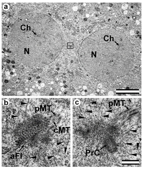 The early prophase zygote has a shorter sperm-typical PC and -atypical DC (28 h after fertilization). (a) General view of the apical region of the flagellar region; (b,c) two of twelve serial sections at high magnification with the apical region of the flagellum (b) and proximal centriole (c). aFl—apical region of flagellum; cMT—central MT of flagellum; Ch—chromosomes; N—nucleus; pMT—MT of peripheral doublets; PrC—proximal centriole; arrowheads indicate MTs in cytoplasm. Scale bars: (a)—5 µm; (b,c)—0.3 µm. All 12 serial sections at high magnification are presented in Figure S4.