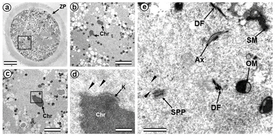 The prometaphase zygote (30 h after fertilization). (a) General view of the zygote at low magnification; (b) spindle region; (c) one of the chromosomes; (d) kinetochore region of the chromosome shown in (c); (e) apical part of axoneme and flagellum-associated pole of spindle. Ax—axoneme of sperm flagellum; Chr—chromosomes; DF—dense fibers of sperm flagellum; K—kinetochore; OM—mitochondrion of oocyte; SM—mitochondrion of sperm; SPP—spindle pole; ZP—zona pellucida; arrowheads indicate MTs of the spindle (only small part of each MT is shown). Scale bars: (a)—20 µm; (b,c)—5 µm; (d)—0.5 µm; (e)—1 µm.