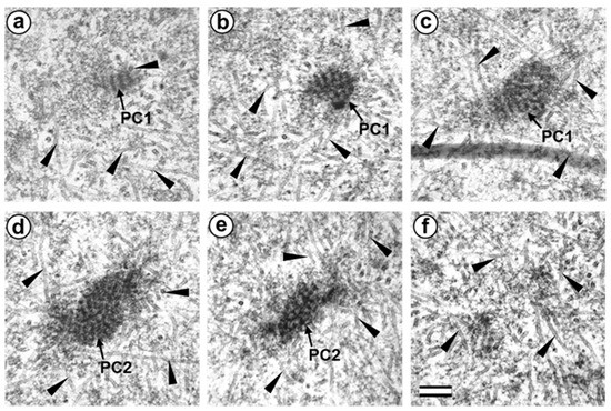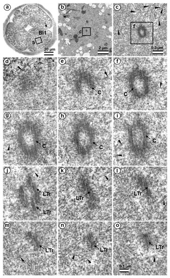 One of these electron-dense bundles was cut transversely; it clearly was an MT triplet, similar to those observed on the transverse section of centrioles (Figure 11d–f, inserts). It can be assumed that the other electron-dense MT bundles were individual MT triplets too.