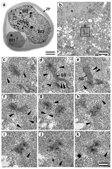 Blastomeres of the three-cell embryo with a centrosome containing several irregularly oriented short MT bundles (30 h after fertilization, prophase of the second cleavage division). (a) General view of the embryo at low magnification; (b) the centrosomal region of blastomere Bl1, right pole; (c–k) serial sections through right pole of blastomere Bl1 at high magnification. Bl1—blastomere No. 1; Bl2—blastomere No. 2; Bl3—blastomere No. 3; Ch—prophase chromosomes; N—nucleus; Tr—triplets of microtubules; ZP—zona pellucida; arrowheads indicate MTs in cytoplasm. Scale bars: (a)—20 µm; (b)—1 µm; (c–k)—0.2 µm. Sections before and after the series are shown in Figure S9.