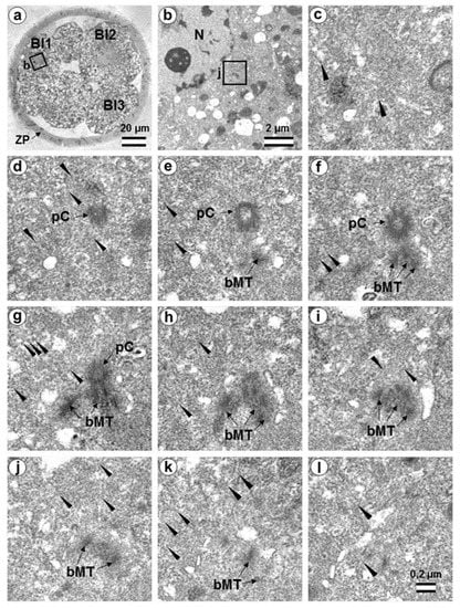Blastomeres of the three-cell embryo whose centrosomal triplets were associated with electron-dense material (30 h after fertilization, prophase of the second cleavage division). (a) General view of the embryo at low magnification; (b) the centrosomal region of blastomere Bl1, left pole; (c–k) serial sections through left pole of blastomere Bl1 at high magnification. Bl1—blastomere No. 1; Bl2—blastomere No. 2; Bl3—blastomere No. 3; Ch—prophase chromosomes; ZP—zona pellucida; arrowheads indicate MTs in cytoplasm. Scale bars: (a)—20 µm; (b)—1 µm; (c–k)—0.2 µm.