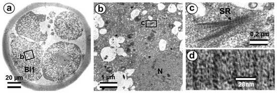 Near the proximal centriole, we observed the formation of a structure appearing to be a dense strand approximately 400 nm long and 50 nm in diameter, surrounded by granular material arranged in rows (SB in Figure 3c–e and Figure S3). MTs of the apical region of the flagellum are disorganized and no longer form the axoneme; clusters of granular material are also found near them (Figure 3c,d and Figure S3).