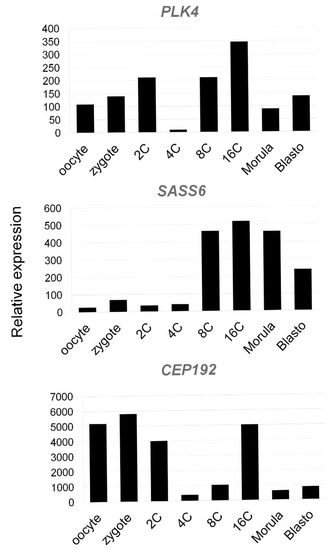 Transcriptome data on bovine preimplantation embryonic development were retrieved from the NCBI Gene Expression Omnibus database (GEO, https://www.ncbi.nlm.nih.gov/geo/ (accessed on 4 May 2020); GEO dataset accession GDS3960). Mean expression values of genes PLK4, SASS6, and CEP192 were calculated from the values reported from two independent microarray hybridizations of mRNA from bovine oocytes, zygotes, 2-cell (2C), 4-cell (4C), 8-cell (8C), 16-cell (16C), morula, and blastocysts. Gene expression values at different stages of embryo development were presented as a histogram.