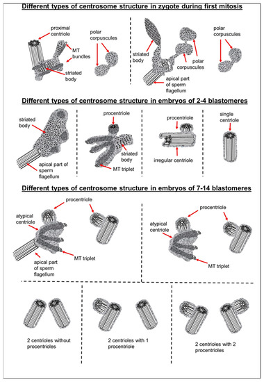 - Abumuslimov, S.S.; Nadezhdina, E.S.; Chentsov, I.S. An electron microscopic study of centriole and centrosome morphogenesis in the early development of the mouse. Tsitologiia 1994, 36, 1054–1061. [Google Scholar] [PubMed]