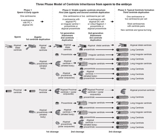 The third model [32] is based on localization of centrosomal and centriolar proteins to two foci in the zygote, as observed by immunocytochemistry. This model suggested the passage of one cycle of centriole duplication, though occurring on two different types of matrices: one of the newly formed centrioles was formed on the proximal sperm centriole, while the second originated from an “atypical centriole”, which is a remodeled form of the distal centriole located near the apical end of the sperm flagellum.