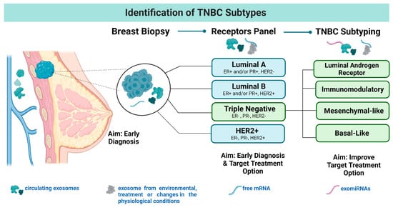Identification of TNBC Subtypes. Breast cancer is a complex disease divided into four principal molecular subtypes. In addition, the TNBC subtype can be stratified into four additional subtypes including: (i) luminal androgen receptor (LAR), (ii) with immunomodulatory (IM) protein expression, (iii) having mesenchymal features (MES, mesenchymal-like), or (iv) BLIS (basal-like and immune suppressed). Segments highlight the presence of the exosomes parallel to the screening process.