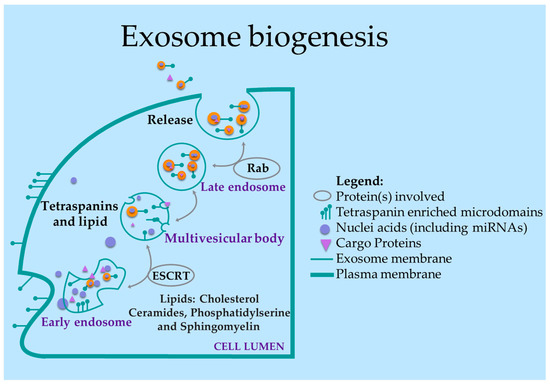 According to the International Society of Extra-cellular Vesicles, their size can range between 50 to 100 nm [28]. Other molecules included in the exosomal cargo are: fragmented or intact mRNA, long non-coding RNA, ribosomal RNA (rRNA), or small non-coding RNA (18–23 nt) [29,30]. Extracellular vesicle secretion, and thereby exosome secretion, mainly relies on the coordination of the endosomal sorting complex required for transport (ESCRT) [31]. Other proteins involved in exosome secretion are tetraspanins (i.e., CD63, CD9, CD81, CD82) and MHC-I and MHC-II [32]. A scheme for exosome biogenesis is present in Figure 2.