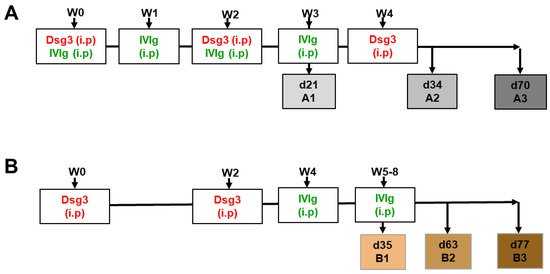 Schematic display of immunization, treatment and analysis schedule. (A) Prevention model shows IVIg treatment (green) during the onset of antibody formation by Dsg3 immunization (red) at week 0 and week 2 (A1) and week 4 (A2, A3) (grey boxes). (B) Quasi-therapeutic model displaying a weekly IVIg application at weeks 4–8, starting at d14 after booster Dsg3 immunization at week 2 (colored boxes). Abbreviations: i.p = intraperitoneal; IVIg = high-dose intravenous immunoglobulin; Dsg3 = desmoglein 3; W = week; d = day.