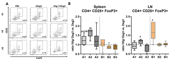 Flow cytometric analysis and quantification of regulatory T cells in lymphatic tissue. (A) Representative display of flow cytometric gating strategy after preselection on singlets and CD4+ expression. (B) Ratio of CD4+ CD25+ FoxP3+ regulatory T cells of IVIg-treated and Dsg3-only immunized mice. Statistical significance was calculated using the unpaired t test with Welch’s correction. p ≤ 0.05.#, p ≤ 0.01 ##. Error bars in graphs represent standard deviation, mean ± SD. n = 6–8 mice per group. A1–3 = prevention protocol, B1–3 = quasi-therapeutic protocol. LN = lymph node.