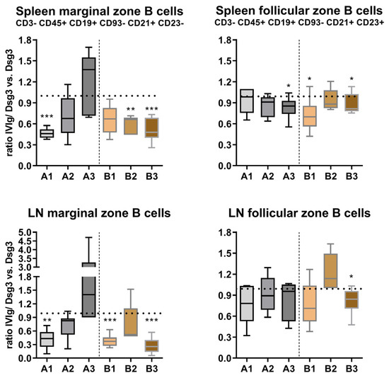 Since a tolerance-inducing effect of IVIg occurred, as shown in Figure 2, we next aimed to analyze how the maturation of the individual B-cell subpopulations was affected by IVIg. Loss of tolerance by autoreactive B cells is proposed to originate from faulty B-cell development. Therefore, the analysis of CD3− CD45+ CD19+ CD93− B cells was further refined, and they were subsequently identified as CD21+ CD23− marginal-zone B cells and CD21+ CD23+ follicular-zone B cells (Supplementary Figure S3). Marginal-zone B cells displayed a similar distribution pattern in the spleen and the lymph node (Figure 4). While the ratio of IVIg/Dsg3 to Dsg3 was initially strongly reduced in the IVIg preventive treatment (A1), at later time points (A2, A3), this ratio became inverted. In contrast, the quasi-therapeutic model revealed a strong reduction in marginal-zone B cells with IVIg treatment in both the spleen and the lymph nodes at all time points (B1, B2, B3). Follicular-zone B-cell distribution was less affected by IVIg application. A slight decrease during the course of the treatment was found in the spleen but not in lymph nodes. In the quasi-therapeutic model, both in splenocytes and lymph-node-derived lymphocytes, a similar but weaker trend, however, was observed, as compared to the marginal-zone population.