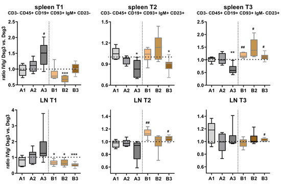 Analysis of CD3− CD45+ CD19+ CD93+ transitional B-cell subpopulations in lymphatic tissue. Upper row: analysis of splenic transitional B cells, lower row: lymph node (LN) transitional B cells. Statistical significance was calculated using the unpaired t test with Welch’s correction. p ≤ 0.05.#, p ≤ 0.01 ## (up-regulation or * down-regulation compared to control, respectively). Error bars in graphs represent standard deviation, mean ± SD. n = 6–8 mice per group. A1–3 = prevention protocol, B1–3 = quasi-therapeutic protocol. LN = lymph node.