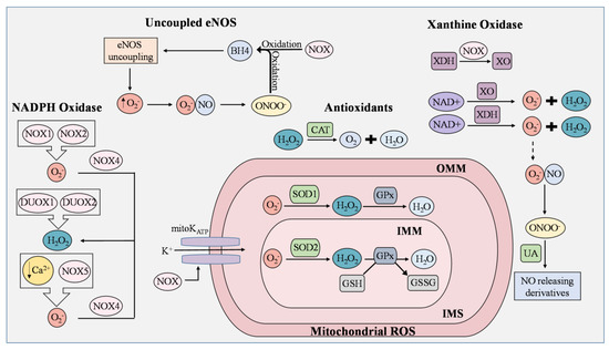 Reactive oxygen species (ROS) are byproducts of enzymatic reactions, composed of both free radical and non-free radical oxygen intermediates, and are generated in numerous cell compartments such as the endoplasmic reticulum (ER), mitochondria, and cell membrane [1,2]. At physiological concentrations, ROS are generated by several sources, including uncoupled endothelial nitric oxide synthases (eNOS), NADPH oxidases (NOX), xanthine oxidases (XO), cyclooxygenases, and the mitochondrial electron transport chain [3]. Antioxidant enzymes such as superoxide dismutase (SOD), catalase (CAT), and peroxidase (POD) are required to manage the production of ROS for cellular health [4,5].