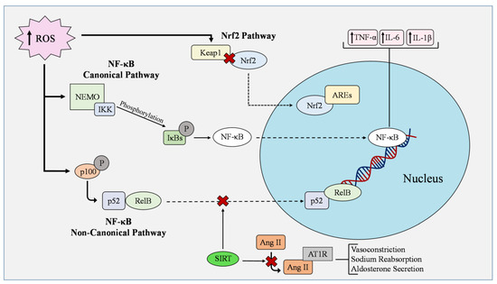 Antioxidant and oxidant pathways in endothelial cells in cardiometabolic disorders. In the nuclear factor kappa B (NF-κB) canonical pathway, IkappaBs (IκBs) are phosphorylated by the IκB kinase (IKK) complex in response to inflammatory signals activating the NEMO-binding domain. The degradation of the IκBs then allows the nuclear transport of NF-κB proteins, which initiates gene expression. In contrast, the non-canonical pathway aims to activate the NF-kB transcription factor RelB/p52 complex by phosphorylating and processing p100 into p52, where it can then bind to RelB. NF-κB regulates the expression of tumor necrosis factor α (TNF-α), interleukin-6 (IL-6), and interleukin-1β (IL-1β). The Nrf2/Keap1–ARE pathway is one of the essential antioxidant pathways for ROS management and it is activated by laminar sheer stress in ECs. Under conditions of oxidative stress, ROS interact with Kelch-like-ECH-associated protein 1 (Keap1) and hinders the ubiquitination of nuclear factor erythroid 2 related factor 2 (Nrf2). Nrf2 then translocates into the nucleus and binds to antioxidant response elements (AREs). Keap1 can turn off this signaling if ROS levels decrease. Sirtuin 1 (SIRT1) plays an inhibitory role in regulating the activity of p53 and NF-κB pathways while other family members manipulate the activation of angiotensin II type 1 receptor (AT1R). Angiotensin II (Ang II) activates AT1R through direct binding, leading to vasoconstriction, sodium reabsorption, and aldosterone secretion.