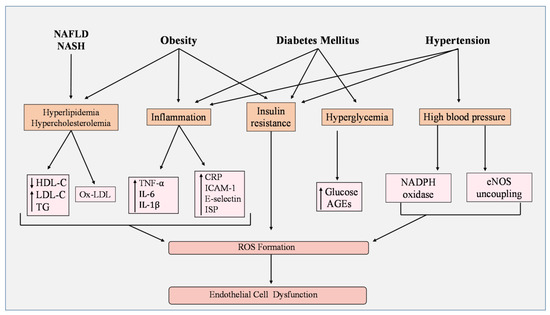 Metabolic disorders and ROS. Hyperlipidemia and hypercholesterolemia presented in non-alcoholic fatty liver disease (NAFLD) and non-alcoholic steatohepatitis (NASH) induce an imbalance in cholesterol levels by lowering high-density lipoprotein cholesterol (HDL-C) and increasing low-density lipoprotein cholesterol and triglycerides. Additionally, oxidized LDL (Ox-LDL) is also enhanced. Obesity not only influences cholesterol levels but also creates inflammation and insulin resistance. Inflammation has been shown to increase the activity of oxidant biomarkers including C-reactive protein (CRP), intercellular adhesion molecule-1 (ICAM-1), E-selectin, and F2-isoprostanes (ISP). Proinflammatory cytokine secretion is enhanced, such as tumor necrosis factor-α (TNF-α), interleukin 1β (IL-1β), and interleukin-6 (IL-6). In diabetes mellitus (DM), hyperglycemia develops along with inflammation and insulin resistance, leading to high levels of glucose and advanced glycation end-products (AGEs). Finally, hypertension, through high blood pressure, can activate NADPH oxidase and induce endothelial nitric oxide synthase (eNOS) uncoupling, while impairing insulin signaling and causing inflammation. Collectively, these factors stimulate the overproduction of reactive oxygen species (ROS) and cause endothelial cell (EC) dysfunction.
