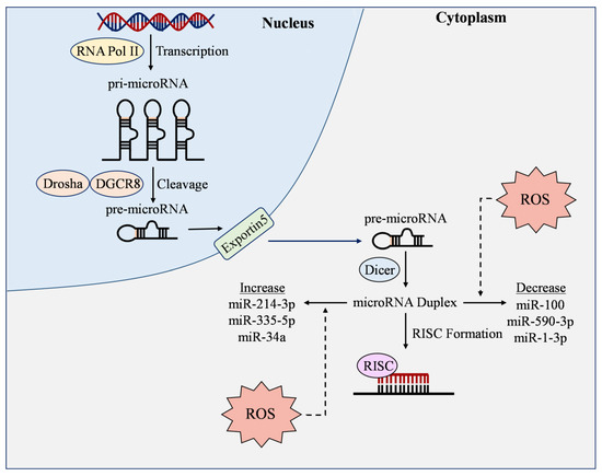 ROS-responsive microRNAs. RNA Polymerase II (RNA Pol II) transcribes genes into pri-microRNA (pri-miRNA), where they are then cleaved by Drosha and DGCR8 into pre-microRNA (pre-miRNA). Pre-microRNA is then transported out of the nucleus by Exportin5, where it is cleaved by Dicer to produce mature microRNA duplex. An RNA-induced silencing complex (RISC) then forms to bind with the 3′-untranslated region of messenger RNAs to exert miRNA functions. During this process, reactive oxygen species (ROS) can increase or decrease the expression of microRNAs, thereby manipulating their ability to regulate oxidative stress and other molecules in endothelial cells.