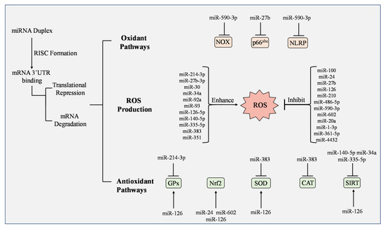 Regulation of ROS production, oxidant pathways, and antioxidants by microRNAs. When mature microRNAs (miRNA) form an RNA-induced silencing complex (RISC), translational repression or mRNA degradation can occur and either enhance or inhibit ROS production. NADPH oxidase (NOX), p66shc, and NLRP participate in oxidant pathways and are inhibited or reduced by miR-590-3p and miR-27b, respectively. Studies have observed greater impact on antioxidants by miRNAs. Glutathione peroxidase (GPx), nuclear factor erythroid 2-related factor 2 (Nrf2), superoxide dismutase (SOD), and various forms of Sirtuin (SIRT) have increased activation by multiple miRNAs including miR-125, miR-24, and miR-602. Some miRNAs have demonstrated inhibitory effects on antioxidants including miR-214-3p, miR-383, miR-140-5p, miR-34a, and miR-335-5p.