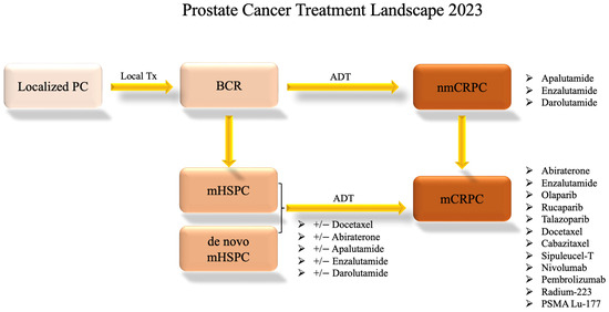 Prostate Cancer Systemic Treatment Landscape. This flow chart shows the standard progression through available treatment options for varying disease statuses as of 2023. Clinical trial options are not included. The information presented is subject to change pending future drug approvals. ADT: androgen-deprivation therapy; BCR: biochemical recurrence; local Tx: local treatment such as radiation or surgery; mCRPC: metastatic castration-resistant prostate cancer; mHSPC: metastatic hormone-sensitive prostate cancer; nmCRPC: non-metastatic castration-resistant prostate cancer; PC: prostate cancer.