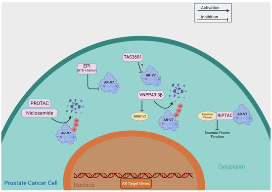Table 1 summarizes agents having putative roles in suppressing AR-Vs through direct functional inhibition, including niclosamide, TAS3681, EPI-7386, Au-AR pep-PROTAC, VNPP433-3β, and RIPTAC. We provide a detailed review of these agents currently undergoing clinical development and summarize their putative mechanisms of action in Figure 3.