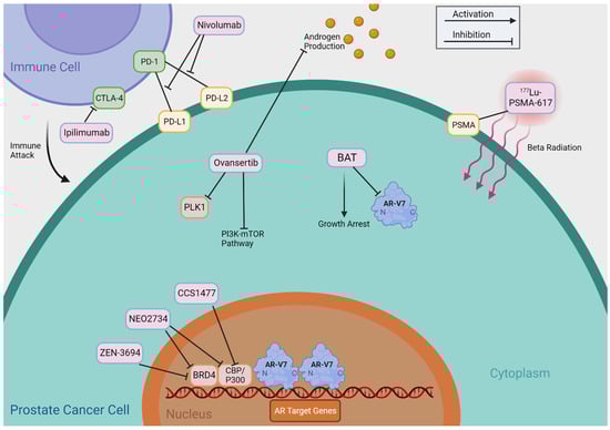 | Immune Checkpoint Inhibitors | Cited papers did not include preclinical studies. | Nivolumab and ipilimumab target specific molecules (PD-1 and CTLA-4 respectively) involved in regulating the immune response, allowing the immune system to better recognize and attack cancer cells. pTVG-AR (MVI-118) is a DNA vaccine encoding the ligand binding domain of AR, which induces CD8+T cell-mediated immune response against cancer cells overexpressing AR. | Nivolumab + ipilimumab: NCT02601014 [63] NCT02985957 [65] NCT05150236 NCT05655715 PTVG-AR (MVI-118): NCT02411786 [67] NCT04090528 NCT04989946 NCT03554317 |