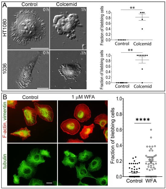 Taking into account that colcemid treatment leads to disruption of microtubules, in addition to collapsing VIFs, we looked for another approach to deplete VIFs from the cell periphery without the disruption of microtubules. For this purpose, we used Withaferin A (WFA), a steroidal lactone from the plant Withania somnifera, which was shown to bind vimentin in vitro and cause the reorganization of VIFs into perinuclear aggregates in cells [54]. We treated HT1080 cells with 1 μM WFA for 3 h and found that this treatment led to the significant accumulation of VIFs in the perinuclear region, whereas the microtubule distribution was not changed (Figure 5B, left). Importantly, WFA treatment also led to a significant increase in the fraction of blebbing cells in the cell population even without additional stimuli (Figure 5B, right).