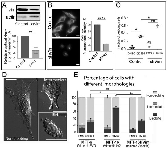 Another possible mechanism by which VIFs can regulate cell blebbing is through signaling-based modulation of cell contractility, which is also known to promote blebbing. Indeed, vimentin knockdown by RNAi or knockout by CRISPR/Cas9 have been recently found to increase RhoA activity in U2OS cells, which in turn activates myosin-II-dependent contractility [70]. This mechanism could be analogous to how the disruption of microtubules leads to an increase in RhoA activity [71,72]. Therefore, stimulation of blebbing by microtubule disruption can be explained by RhoA activation. Multiple studies have shown that blebbing is stimulated by an increase in RhoA activity, which leads to the reassembly of the actin cortex and thus regulates both bleb expansion and retraction [73,74]. On the other hand, we did not find differences in myosin II activity among MFT6, MFT16, and MFT16-HVim cells. Also, neither changes in myosin II activity and traction force generation [59], nor effects on cortical stiffness [75] have been detected in vimentin-null mouse fibroblasts by others. We also did not detect differences in bleb formation between control and vimentin-deficient cells at the basal level, but the differences became clearly apparent after additional stimulation by CK-666. A possible explanation of these phenomena is that cells derived from knockout mice had much more time to compensate for the aberrantly high contractility produced by the downregulation of vimentin, as compared with relatively short-term vimentin depletion in cultured cells, in which the level of blebbing showed an upward trend even at basal level although it did not reach statistical significance. We also used fibroblasts derived from vimentin knockout mice and observed enhanced cell blebbing in cells depleted of VIFs. Moreover, the transfection of vimentin into these cells led to a decrease in the fraction of blebbing cells to the level found in control mouse fibroblasts. Thus, we propose that VIFs can protect cells from blebbing not only through RhoA signaling, but also more directly by interacting with the cell cortex and regulating its architecture.