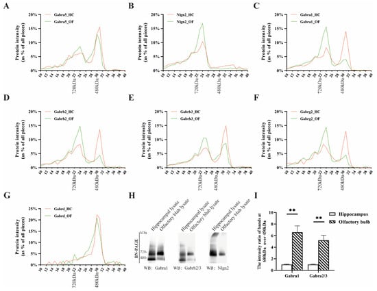 3.3. Analysis of Hippocampal and Olfactory Bulb GABAAR Subcomplexes with Blue Native Gel Electrophoresis–Mass Spectrometry