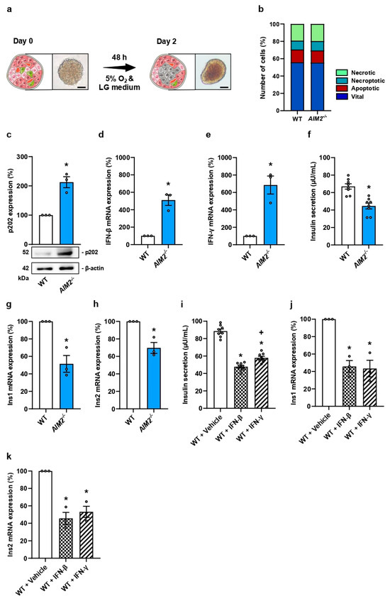 AIM2 deficiency reduces insulin expression in an IFN-dependent manner. (a) Schematic illustration of the experimental in vitro setting. Freshly isolated islets (left: bright field microscopic image; scale bar: 75 µm) were exposed to hypoxia (5% O2) and low glucose (LG) medium (1 g/L glucose) for 48 h to induce central cell death within the islets (right: bright field microscopic image; scale bar: 75 µm). These ischemic islets were used for further experiments. (b) Propidium iodide/annexin V-stained cells (in % of total cell number) were quantitatively analyzed in ischemic WT and AIM2−/− islets subdivided in necrotic, necroptotic, apoptotic, and vital cells (n = 3 each). (c) Representative Western blot of p202 expression from extracts of ischemic WT and AIM2−/− islets (lower panels). Quantitative analysis of p202 expression (upper panel). β-actin was used as loading control. Data are expressed in % of WT (n = 3 each). Mean ± SEM. * p < 0.05 vs. WT. (d,e) IFN-β (d) and IFN-γ (e) mRNA expression in ischemic WT and AIM2−/− islets were quantitatively analyzed. Data are expressed in % of WT (n = 3 each). Mean ± SEM. * p < 0.05 vs. WT. (f) Quantitative analysis of insulin secretion (µU/mL) from ischemic WT and AIM2−/− islets (n = 8 each). Mean ± SEM. * p < 0.05 vs. WT. (g,h) Ins1 (g) and Ins2 (h) mRNA expression in ischemic WT and AIM2−/− islets were quantitatively analyzed. Data are expressed in % of WT (n = 3 each). Mean ± SEM. * p < 0.05 vs. WT. (i) Quantitative analysis of insulin secretion (µU/mL) from ischemic WT islets exposed to vehicle, IFN-β, or IFN-γ (n = 8 each). Mean ± SEM. * p < 0.05 vs. WT + Vehicle; + p < 0.05 vs. WT + IFN-β. (j,k) Quantitative analysis of Ins1 (j) and Ins2 (k) mRNA expression in ischemic WT islets exposed to vehicle, IFN-β, or IFN-γ. Data are expressed in % of WT + Vehicle (n = 3 each). Mean ± SEM. * p < 0.05 vs. WT + Vehicle.
