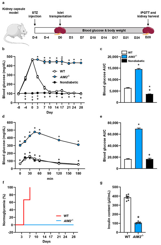 AIM2 deficiency in transplanted islets impairs restoration of normoglycemia in diabetic mice. (a) Experimental in vivo setting. Eight days prior to islet transplantation, we induced a diabetic phenotype by STZ injection. On day 0, 400 islets were transplanted under the kidney capsule of diabetic recipient mice. Subsequently, we measured body weights and blood glucose levels twice a week. On day 28, we performed an IPGTT and excised the kidneys to determine the insulin content of the transplants. (b) Blood glucose levels (mg/mL) of diabetic recipient mice transplanted with WT and AIM2−/− islets from day -8 to day 28 (n = 6 each). Nondiabetic animals were used as negative control (n = 6 each). Mean ± SEM. * p < 0.05 vs. WT; + p < 0.05 vs. AIM2−/−. (c) AUC of the blood glucose levels from (b) (n = 6 each). Mean ± SEM. * p < 0.05 vs. WT; + p < 0.05 vs. AIM2−/−. (d) Quantitative analysis of blood glucose levels (mg/dL) on day 28 according to the IPGTT of diabetic recipient mice transplanted with WT and AIM2−/− islets (n = 6 each). Nondiabetic animals were used as negative control (n = 6 each). Mean ± SEM. * p < 0.05 vs. WT; + p < 0.05 vs. AIM2−/−. (e) AUC of IPGTT from (d) (n = 6 each). Mean ± SEM. * p < 0.05 vs. WT; + p < 0.05 vs. AIM2−/−. (f) The fraction of animals achieving physiological blood glucose levels (n = 6 each). (g) Insulin content (µU/mL) of the removed grafts from diabetic mice transplanted with WT and AIM2−/− islets (n = 6 each). Mean ± SEM. * p < 0.05 vs. WT.