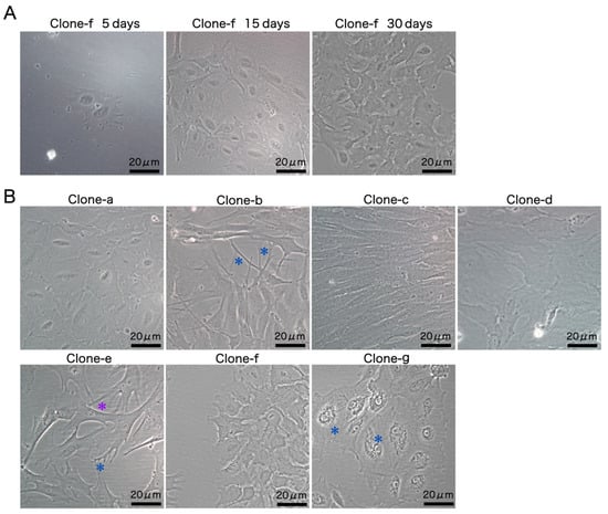 (A) The growth of clone-f. Initial cell cloning revealed slow growth, followed by an accelerated proliferation rate, resulting in monolayer formation within roughly 30 days in a single well of a 24-well plate. (B) The phase contrast images depict seven cell clones derived from the SCK cell line, each with unique morphological characteristics: clone a: an epithelial-like morphology; clone b: a multipolar shape with dendritic structures (blue asterisks); clone c: fibroblastic-like morphology; clone d: flat and irregular shape; clone e: multipolar morphology with cytoplasmic processes (purple asterisk) and dendrites (blue asterisk); clone f: polygonal shape approximately 20 μm in diameter; clone g: polygonal morphology with perinuclear vacuolation (blue asterisks).
