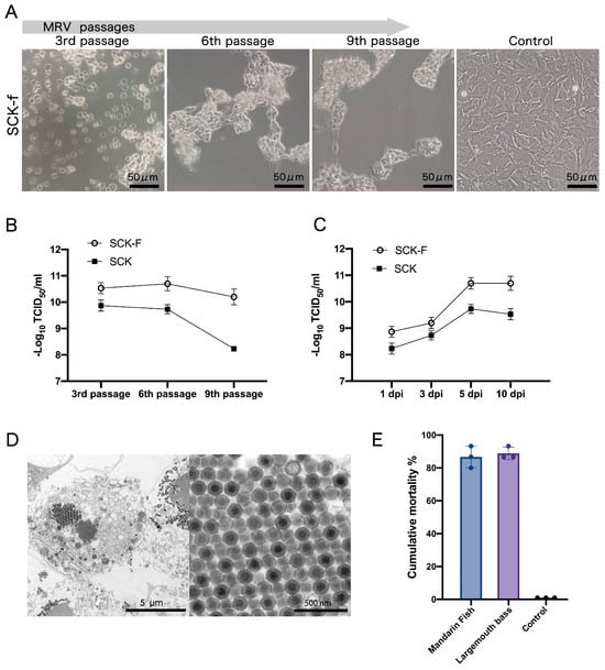 (A) Phase contrast microscopic images depict CPE in SCK-f cells elicited by the 3rd, 6th, and 9th passages of MRV at 3 dpi. (B) Comparative infectious dynamics of MRV in SCK and SCK-f cells. Viral titers of the 3rd, 6th, and 9th passages of MRV are expressed as TCID50/mL. Each titer value represents the mean ± SE derived from three biological replicates. (C) Comparison of the MRV replication dynamics in SCK and SCK-f. Growth curves were generated by measuring the viral titers at 1, 3, 5, and 10 dpi and were expressed as TCID50/mL. Titer values represent mean ± SE for 3 biological replicates. (D) Transmission electron micrographs of the MRV-infected SCK-f cells, revealing the substantial number of virions characterized by a hexagonal cross-section and an electron-dense core. Some of these virions demonstrate a crystalline array. (E) The cumulative mortality rates in MRV-infected mandarin fish and largemouth bass; mean ± SD from three independent experiments.