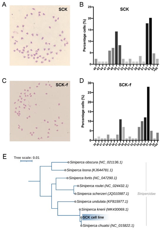 Giemsa staining was used to label chromosomes in SCK and SCK-f cells, with statistical analysis conducted on 100 cells per group. (A) Image illustrating SCK cells containing 63 chromosomes. (B) Chromosome number distribution in SCK cells. (C) Image illustrating SCK-f cells with 57 chromosomes. (D) Chromosome number distribution in SCK-f cells. (E) Phylogenetic tree of mitochondrial 16S and COI genes from SCK and eight Sinipercidae species.