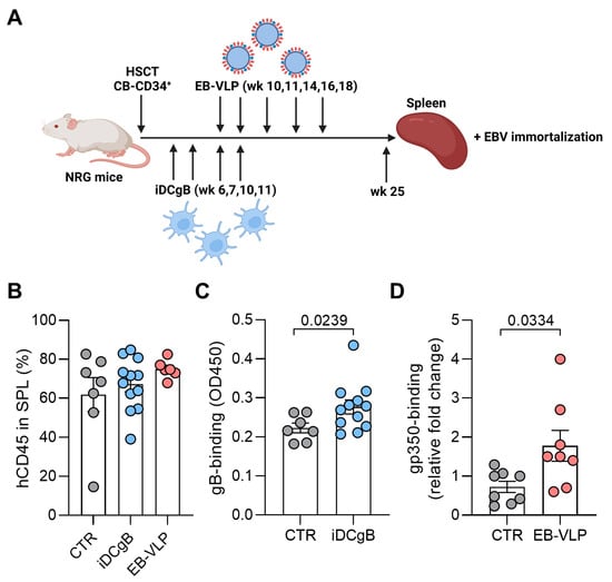 Fully humanized mice immunized with either iDCgB or EB-VLPs produce human IgGs reactive against gB and gp350, respectively. (A) Scheme of immunization of humanized mice and analyses. NRG mice were transplanted with CB-derived CD34+ stem cells. Afterwards, the animals were immunized either four times with iDCgB (autologous to the CB source) or five times with EB-VLPs. 25 weeks after HCT, the mice were sacrificed. Blood and spleen samples were harvested. (B) Reconstitution of humanized mice (CTR = grey; iDCgB = blue and EB-VLP = red) depicted in percentage (%) of human lymphocytes (CD45) in blood after 25 wks. Each dot represents one experimental mouse. (C) Detection of HCMV-gB specific IgG iDC (OD450) in plasma of humanized mice measured by ELISA. CTR not immunized are shown in grey and iDCgB immunized in blue. Each dot represents one mouse. (D) EB-VLPs immunized mice showed gp350-specific human IgG antibodies. The sera from immunized and control mice were used for an ELISA to detect gp350-specific human IgG antibodies. ELISA was performed with undiluted mice plasma obtained from CTR mice (grey) or from mice immunized with EB-VLPs (red). Standard deviation of the mean is indicated and students t-test with Welsh`s correction was used for statistical analysis as indicated.