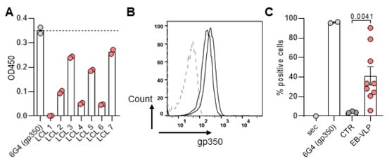 B cell lines generated from HIS mice immunized with EB-VLP were screened for secretion of gp350-specific human IgGs. Some lines secreted gp350-specific IgGs at levels comparable to that of a rat-derived hybridoma secreting a monoclonal gp350-specific antibody (6GA in Figure 3A) as tested in an ELISA assay with the recombinant gp350 protein. The specificities of these antibodies were confirmed in a subsequent flow cytometry assay using PCI 1 cells stably expressing gp350 on their surface (p = 0.0041) (Figure 3B,C).