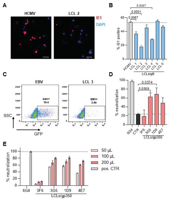 Finally, we investigated whether supernatants of immortalized B cell lines produced gB- and gp350-specific IgGs that could neutralize HCMV and EBV infection in vitro, respectively. For HCMV, we used a neutralization assay, which is based on the TB40-GLuc HCMV strain used to infect MRC-5 fibroblasts [25,26]. Two out of six supernatants (LCL 2 and LCL 4) containing gB-specific IgGs revealed a neutralizing activity of up to 50% (Figure 4A,B). Similarly, we performed neutralization assays for EBV, where we analyzed the inhibition of infection in a flow cytometry-based assay. In fact, two out of four supernatants containing gp350-specific IgGs showed up to 70% inhibition of infection as compared to control supernatants that revealed no detectable neutralizing activities (3G5; p = 0.0569 and 1D9; p = 0.0374) (Figure 4C,D). Titration of the supernatants revealed the highest neutralizing capacity for supernatant for LCL 1D9 and 3G5 (internal name) (Figure 4E).