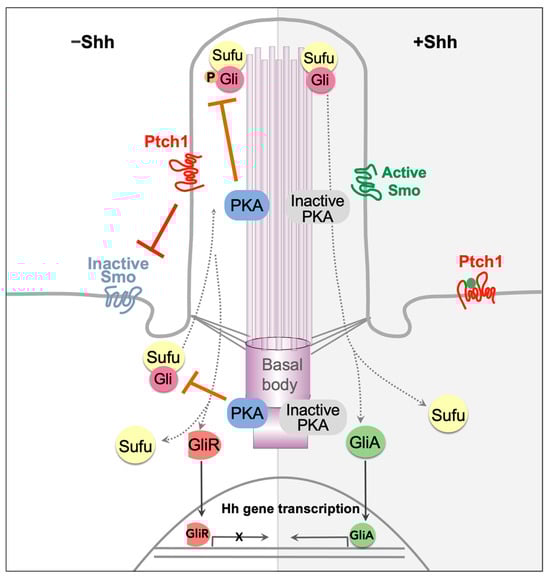 Transduction of Hedgehog signaling. In the absence of the ligand, Shh, Ptch1 in the cilium inhibits Smo activity. Sufu sequesters the Gli transcription factors, and the complex translocates through the primary cilium. Gli is phosphorylated by PKA at the basal body and cilia, priming it for proteolytic processing into repressor form. As a result, the transcription of Hh target genes is off (left). Upon Shh binding to Ptch1, the complex exits the cilium. Subsequently, Smo enters the cilium and inactivates PKA. This results in Gli dissociation from the Sufu and its ultimate activation. Active Gli enters the nucleus to initiate the transcription of Hh target genes (right).