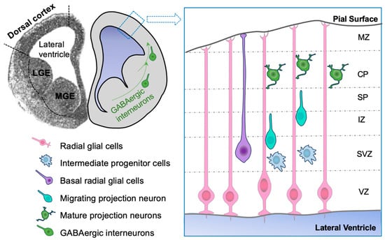 - Yu, X.; Zecevic, N. Dorsal radial glial cells have the potential to generate cortical interneurons in human but not in mouse brain. J. Neurosci. 2011, 31, 2413–2420. [Google Scholar] [CrossRef]