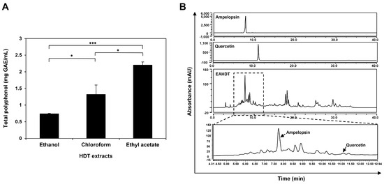 Total polyphenol content and HPLC analysis of HDT extracts. (A) Total polyphenol content of ethanol, chloroform, and ethyl acetate extracts from HDT. (B) HPLC analysis of EAHDT. * p < 0.05, *** p < 0.001.