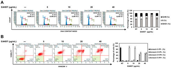 Effect of EAHDT on cell cycle and cell death of Huh7-derived LCSCs. (A,B) Huh7 LCSCs were exposed to EAHDT (5, 10, 20, 40 μg/mL) for 48 h. Cell-cycle distribution (A) and cell death (B) were analyzed using the Guava® Muse® Cell Analyzer. ** p < 0.01 vs. the control.