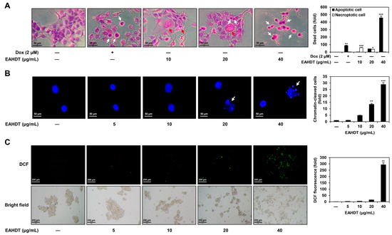 EAHDT induces features of both necroptosis and apoptosis in Huh7-derived LCSCs. (A–C) Huh7 LCSCs were exposed to EAHDT (5, 10, 20, 40 μg/mL) for 24 h. (A) Cell morphology was observed by staining with H&E. Doxorubicin (Dox) is a control drug that induces apoptosis. Necroptotic and apoptotic cell morphologies are indicated by red and white arrows, respectively. (B) Changes in nuclear morphology were observed by staining with DAPI under a fluorescence microscope. Chromatin cleavage and condensation are indicated by white arrows. (C) ROS levels were detected by DCF fluorescence. * p < 0.05, ** p < 0.01, *** p < 0.001 vs. the control.