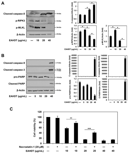 We next examined the effects of EAHDT on the expression of molecular markers that play a critical role in the activation of necroptosis and apoptosis in Huh7-derived LCSCs. When caspase-8, the initiator of the extrinsic apoptotic pathway, is inhibited, RIPK3 and its substrate MLKL become activated through phosphorylation, leading to necroptosis [15]. As shown in Figure 6A, treatment with 10 µg/mL of EAHDT led to caspase-8 inactivation and an increase in phosphorylated RIPK3 and MLKL levels in Huh7 LCSCs. However, as EAHDT concentrations increased to 20 and 40 µg/mL, a dose-dependent shift occurred in the mode of cell-death induction, with elevated levels of cleaved caspase-8 and reduced expression of phosphorylated RIPK3 and MLKL. These results indicate that EAHDT shifts the mode of cell-death induction from necroptosis to apoptosis as the treatment concentration increases. This observation was consistent with the increased levels of cleaved caspase-9, caspase-3, and poly(ADP)-ribose polymerase (PARP), key regulators of the intrinsic apoptotic pathway [12], which were significantly upregulated only at the higher EAHDT concentration of 40 µg/mL (Figure 6B). In addition, we confirmed the necroptotic effect of EAHDT using necrostatin-1, a selective necroptosis inhibitor. Figure 6C shows that necrostatin-1 partially rescued the viability of Huh7 LCSCs that had been inhibited by EAHDT. Notably, the restorative effect of necrostatin-1 was higher with 10 and 20 µg/mL EAHDT treatments than with the 40 µg/mL treatment. These findings collectively suggest that, at lower doses, EAHDT predominantly activates the necroptotic pathway rather than the apoptotic pathway in Huh7-derived LCSCs.